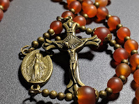 Carnelian is a semi-precious gemstone that comes from Brazil, India, and parts of Eastern Europe. This traditional 5 decade rosary uses the red stones in a matte finish. Combined with the antique bronze finished accent beads, crucifix, and center, it creates a piece that looks like piece your grandmother may have used.